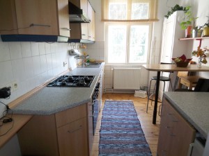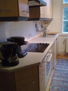 sonnig, mit Fenster nach Osten den Gärten zu. Voll ausgestattet mit Geschirrspüler, Mikrowelle, Kaffeemaschine, Heißwasserkocher, Elektroherd (Ceranfeld) und -backofen und natürlich Kühl- und Gefrierschrank.